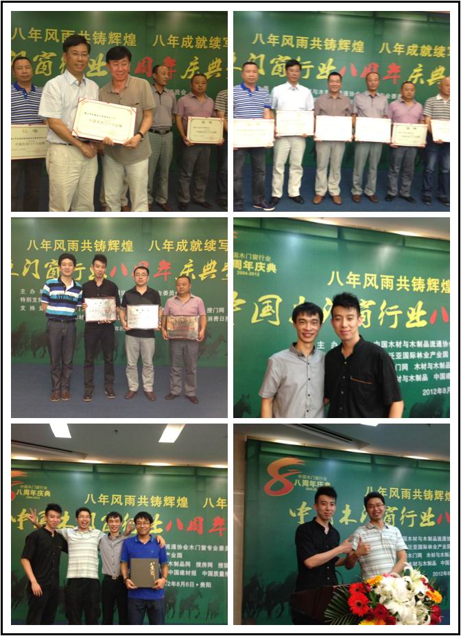 2012年8月6日,中國(guó)木門窗行業(yè)8周年慶典暨表彰大會(huì)在貴陽嘉華酒店如期舉行。中國(guó)木材與木制品流通協(xié)會(huì)會(huì)長(zhǎng)劉能文,中國(guó)木材與木制品流通協(xié)會(huì)木門窗專業(yè)委員會(huì)會(huì)長(zhǎng)張國(guó)林,中國(guó)木材與木制品流通協(xié)會(huì)木門窗專業(yè)委員會(huì)秘書長(zhǎng)王永林,中國(guó)木材與木制品流通協(xié)會(huì)木門窗專業(yè)委員會(huì)常務(wù)副秘書長(zhǎng)謝春林及各企業(yè)代表參加本次會(huì)議。佛山樹興木門廠作為協(xié)會(huì)的理事單位成員也參加了此次會(huì)議。會(huì)上,本廠榮獲協(xié)會(huì)頒發(fā)的“中國(guó)全木門十大品牌”稱號(hào),可謂實(shí)至名歸。另外,樹興西安紅星店和寧波永達(dá)店更是榮獲協(xié)會(huì)頒發(fā)的“中國(guó)木門行業(yè)星級(jí)店”的光榮稱號(hào)。本廠產(chǎn)品“風(fēng)生水起”也榮獲2012中國(guó)木門(嘉寶莉杯)設(shè)計(jì)大賽“最受消費(fèi)者歡迎款式”之稱。